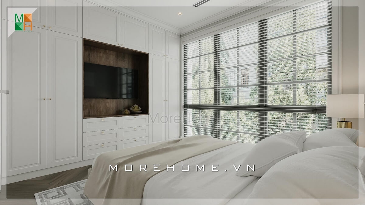 Phòng ngủ của biệt thự được bố trí nhiều tủ kệ hiện đại vừa tăng thêm vẻ đẹp của căn phòng lại tiện lợi, gọn gàng.