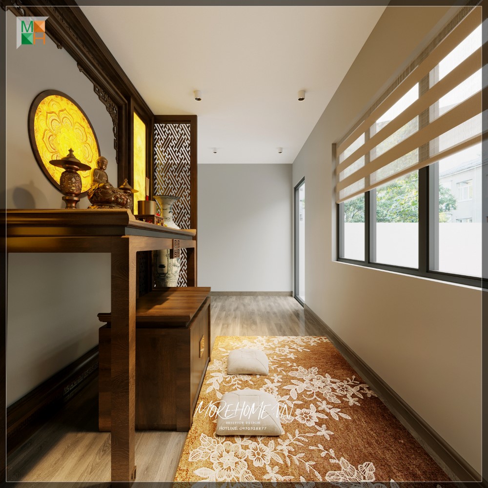 Phòng thờ được trang bị nội thất gỗ tự nhiên với gam màu vàng nhẹ nhàng, góp phần tạo nên một không gian an nhiên, linh thiêng và thư thái cho gia chủ.