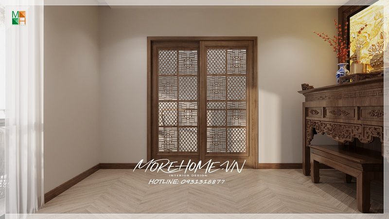 Tủ thờ gỗ óc chó nâu trầm kết hợp với màu sắc của các món đồ nội thất và đồ trang trí khác trong phòng thờ tạo nên một sự đồng nhất và linh thiêng, phong thủy.